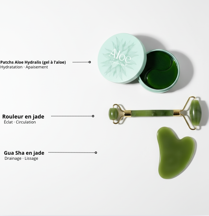 Les patchs yeux Aloe Hydralise Le roller & le gua sha en jade