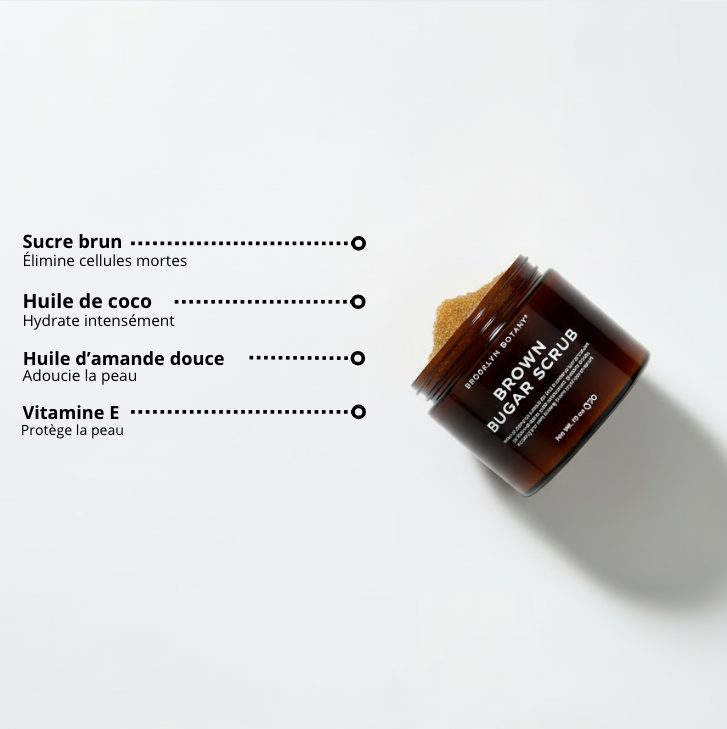 grâce à notre Brown Sugar Scrub, un exfoliant doux mais efficace, formulé pour lisser, adoucir et illuminer instantanément. Sa texture riche au sucre brun élimine délicatement les impuretés tout en nourrissant la peau.